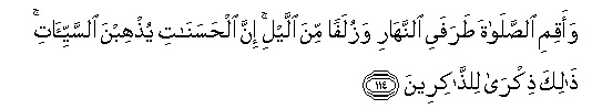 “Gündüzün iki ucunda ve gecenin bir kısmında namaz kıl. Doğrusu iyilikler kötülükleri giderir.” (Hud suresi : 114)