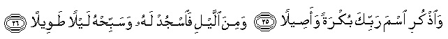 “Ve sabah, akşam Rabbinin adını zikret. Gecenin bir bölümünde O’na secde et ve geceleyin uzun uzadıya O’nu tesbih et.” (İnsan Suresi, 25-26)