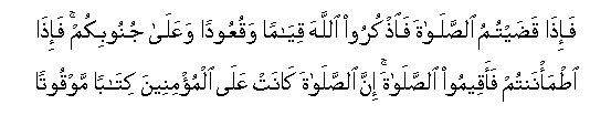 “Namazı bitirdiğinizde, Allah’ı ayaktayken, otururken ve yan yatarken zikredin. Artık ‘güvenliğe kavuşursanız’ namazı dosdoğru kılın. Çünkü namaz, mü’minler üzerinde vakitleri belirlenmiş bir farzdır.” (Nisa Suresi, 103)