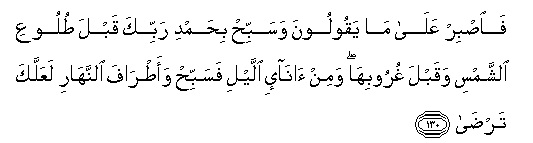 “…Güneşin doğmasından önce de, batmasın dan önce de Rabbını övgü ile tesbih et. Gecenin bazı saatlerinde ve gündüzün etrafında (iki ucunda) da tesbih et ki, rızaya ulaşasın.”
